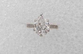 A diamond ring, claw-set with a pear-shaped diamond weighing approximately 1.50 carats, to shoulders millegrain-set with brilliant-cut diamonds, mounted in platinum, size G, British hallmarks