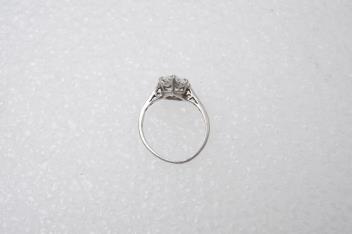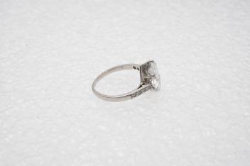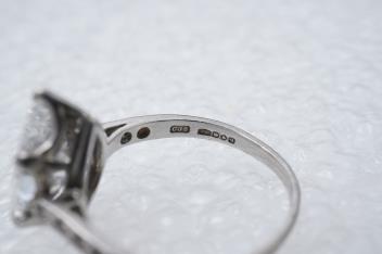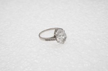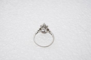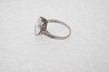Central diamond measuring approximately 10.9 x 7.6 x 3.4mm, calculated to weigh approximately 1.50 carats, shallow proportions and a pretty, antique cut, spreading more towards 2 carats, in our opinion approximately E/F colour, VS clarity (very slightly wear to culet facet edges), nil to faint fluorescence. Ring very nicely made, shank misshapen, easily rectified by a specialist jeweller.