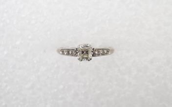A diamond ring, 1920s, claw-set with an Asscher-cut diamond weighing approximately 0.35 carats, to shoulders set with single-cut diamonds in millegrain borders, mounted in platinum, size K