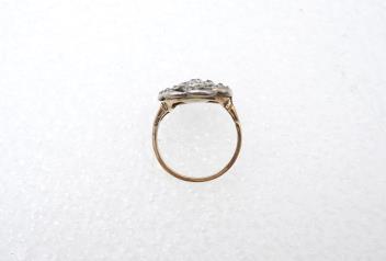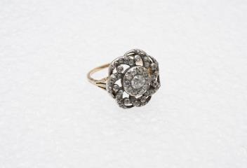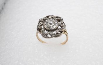 A diamond ring, early 19th century and later, centring on a cluster within a swirled border, set with circular-cut, cushion-shaped and rose-cut diamonds, in closed-back silver settings, to a later gold band, size L