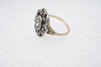 Central diamond approximately 0.20 carats. Likely originally a button, later mounted as a ring, Very pretty, in good, wearable condition.