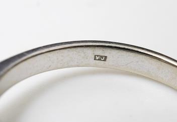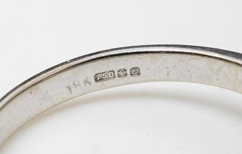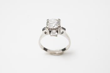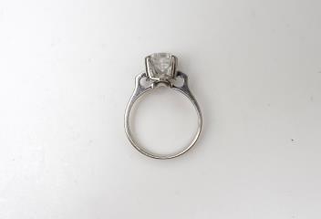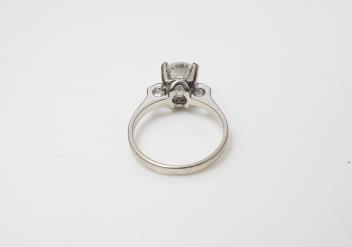 Good colour, approximately G-H, clarity grade I1 - large surface-reaching fissure, and accompanying crystal, still a bright and attractive stone, measuring approximately 7.35 x 7.35 x 4.8mm, med-strong blue fluorescence. Slight movement in mount, but secure.