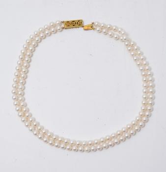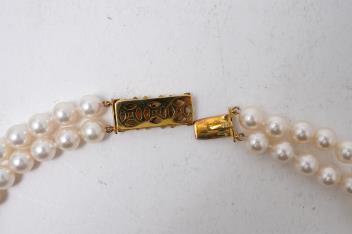 A double strand cultured pearl necklace, the two strands of cultured pearls measuring approximately 8mm, to a gold clasp of rectangular outline, length 53cm, clasp stamped 585 14K