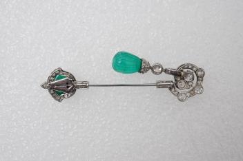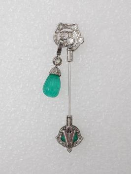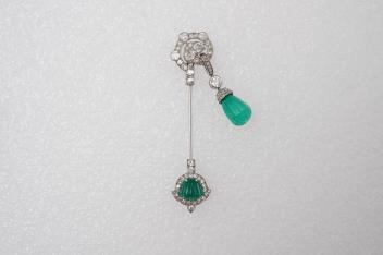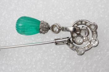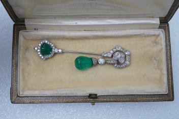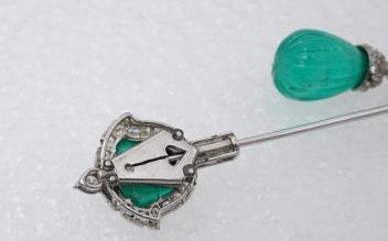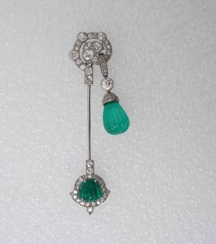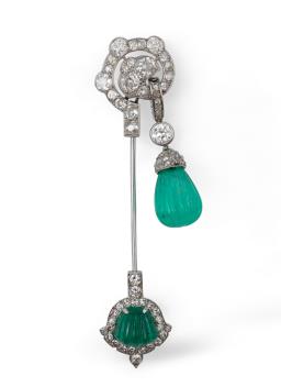 Lot 759 , A fine Art Deco carved emerald and diamond jabot pin, circa 1925
