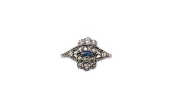 A fine Art Deco sapphire and diamond ring, circa 1920, centring on a marquise-shaped sapphire, within a millegrained openwork mount set with circular-cut diamonds totalling approximately 0.40 carats, mounted in platinum, size M, sapphire possibly synthetic