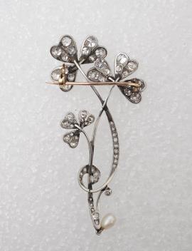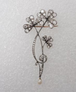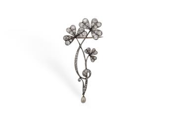 A fine Art Nouveau diamond brooch, circa 1910, designed as a spray of trefoil leaves, set with circular-cut diamonds totalling approximately 3.00 carats, suspending a pearl pendant, mounted in platinum, length 6.4cm, pearl untested