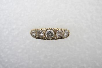 A five-stone diamond ring, set with a sequence of five brilliant-cut diamonds totalling approximately 0.70 carats, spaced by smaller single-cut diamonds, mounted in 18ct gold, size R1/2, British hallmarks, gross weight approximately 5 grams