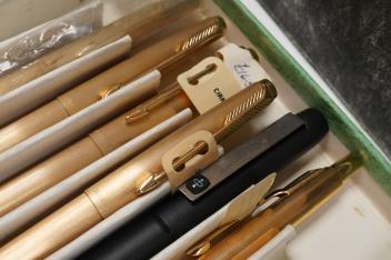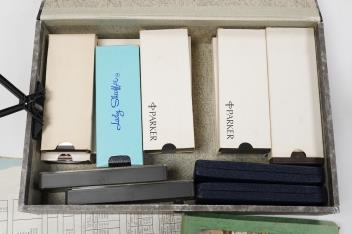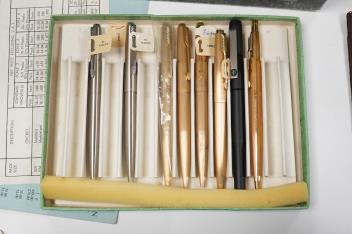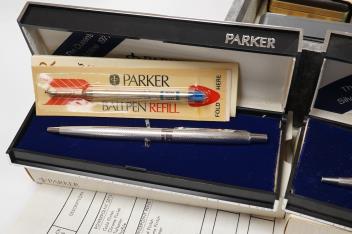 Lot 2118 , A folder of Parker and Sheaffer pens and ball pens, mostly boxed and a Parker Pen box containing eight items