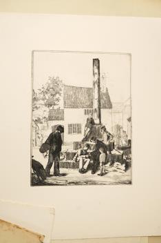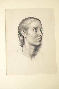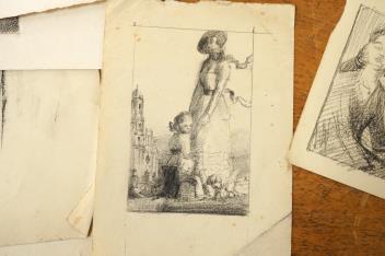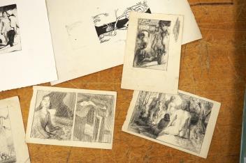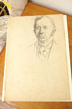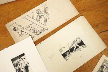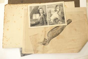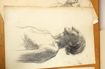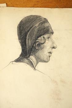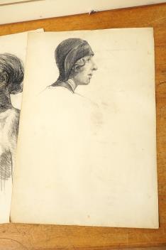 Lot 2740 , A folio of pencil sketches, gouaches, charcoals and etchings, to include portrait studies, an etching by Carl Wragg and one by Phylis E Gussen? and two ink illustrations, letters of the alphabet, unframed