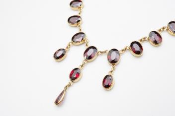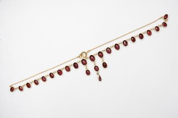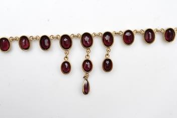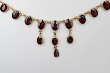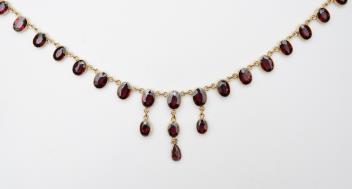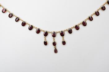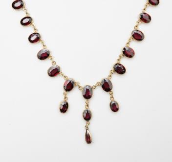 A garnet necklace, the front composed of links set with oval garnets, the central three links suspending similar garnet pendants, to a belcher chain back chain, length 41cm, numbered 830