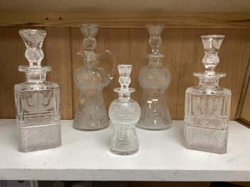 Lot 1514 , A garniture of thistle-shaped and engraved glass decanters and stoppers, largest 31cm high