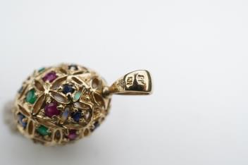 A gem-set egg pendant and an Edwardian seed pearl pendant, the egg pendant of openwork construction, set with circular-cut rubies, emeralds and sapphires, mounted in 9ct gold, length 2.1cm, British hallmarks, gross weight approximately 2.5 grams; the Edwardian pendant of snowflake design set with split seed pearls, mounted in gold, length 3cm, stamped 15CT, gross weight approximately 2.5 grams