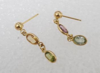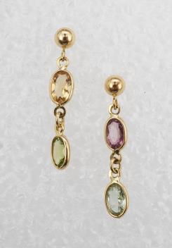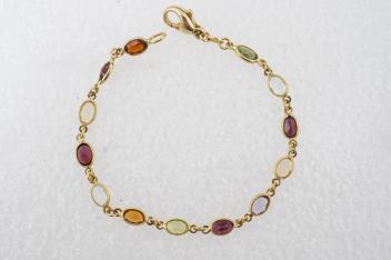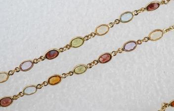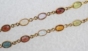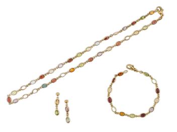 A gem-set parure, comprising: a necklace, bracelet and pair of earrings, each set with oval citrines, garnets, blue topazes, tourmalines and amethysts, mounted in 18ct gold, necklace 40cm, bracelet 17cm, each with British hallmarks, earrings 2.5cm, post fittings stamped 750, combined gross weight 17 grams
