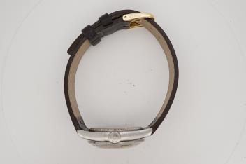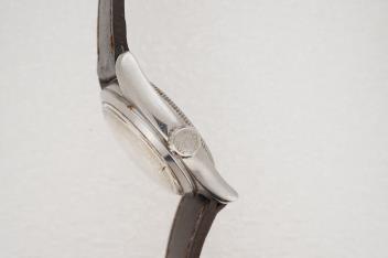 Numerous surface abrasions to the case back and minor nicks and surface scratches to the case sides also, all consistent with age and general use. Scratches and interior dirt to the dial cover. Dial a little discoloured with some pitting. Watch ticks when wound and the hands adjust.
