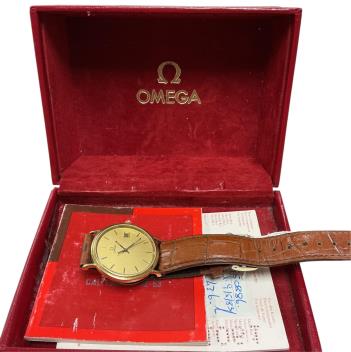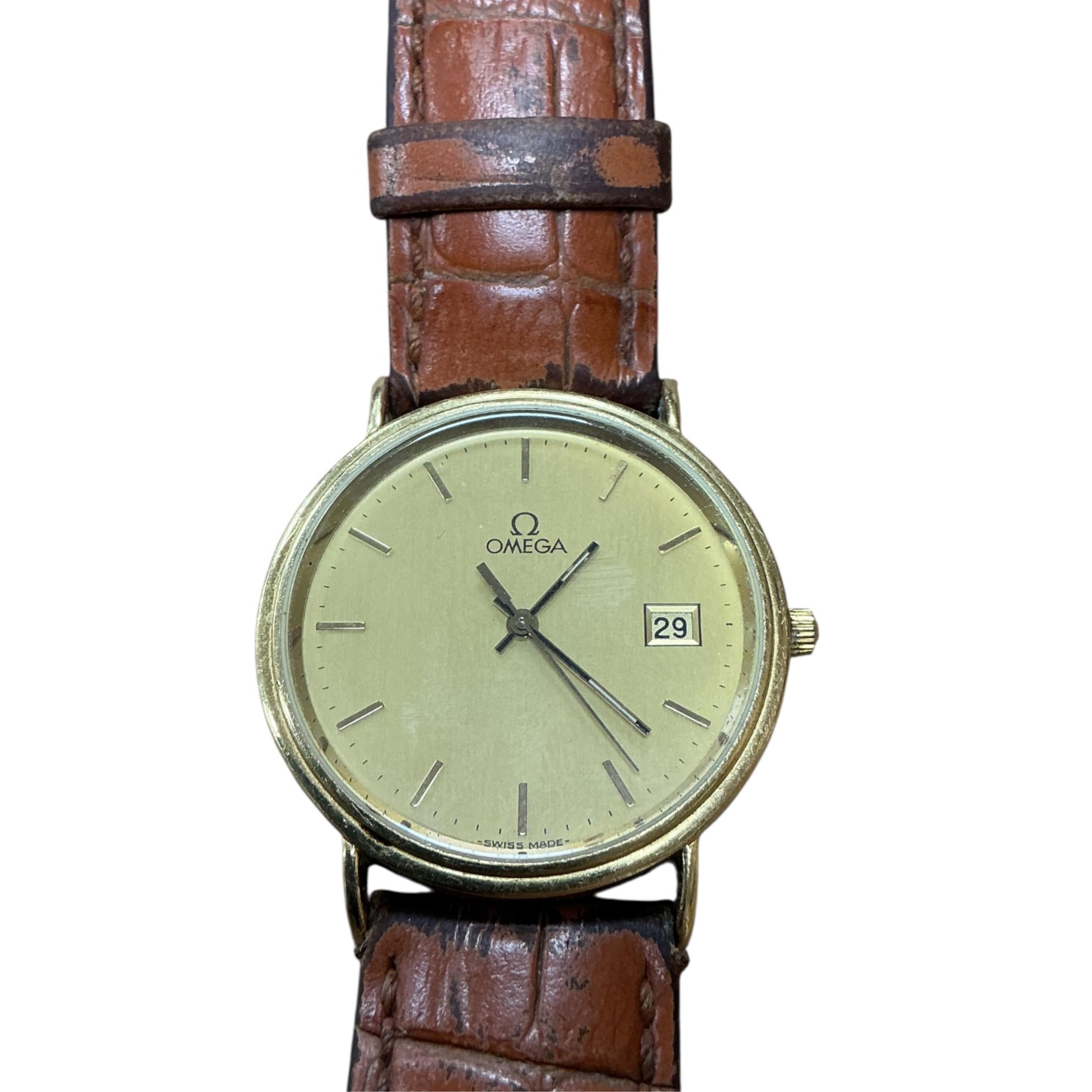 Lot 1901 , A gentleman's 1980's 18k Omega quartz wrist watch, with baton numerals and date aperture, movement c.1430, case diameter 33mm, on an associated leather strap, with Omega box.