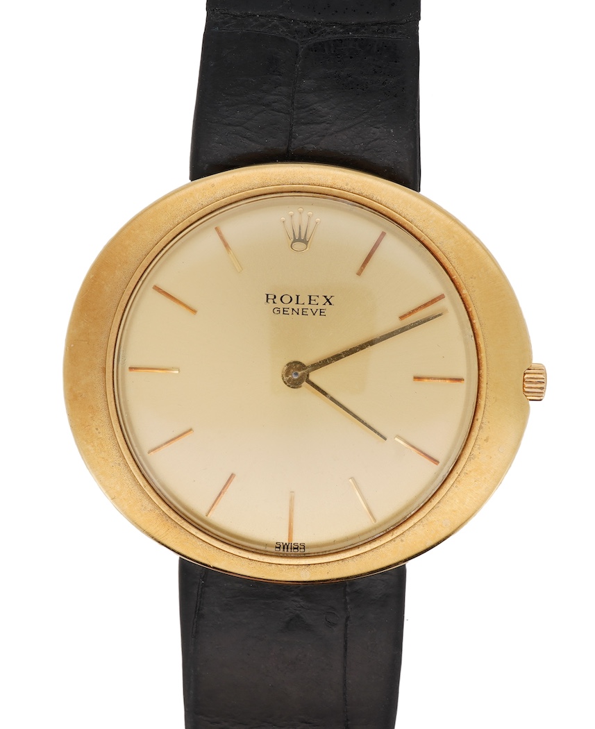A gentleman's late 1960's 18ct gold Rolex manual wind dress wrist watch, with oval dial and baton numerals, the inner case numbered 36345, movement c.1600, case diameter 36mm, on a Rolex black leather strap with gold plated Rolex buckle, gross weight 32 grams, no box or papers.