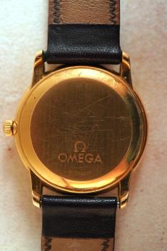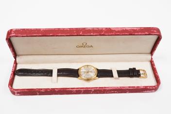 Lot 1906 , A gentleman's late 1990's 18ct gold Omega Automatic Chronometer wrist watch, with baton numerals and date aperture, case diameter 35mm, on an associated leather stray with plated buckle with Omega insignia, with box and