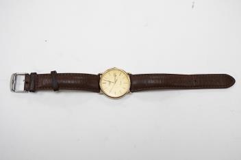 Lot 900 , A gentleman's late 20th century Longines 9ct gold quartz wrist watch, with baton numerals and date aperture, the case back with engraved monogram, case diameter 32mm, on an associated leather strap, no box or papers.