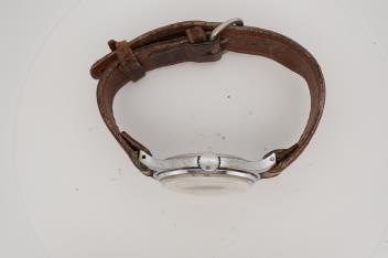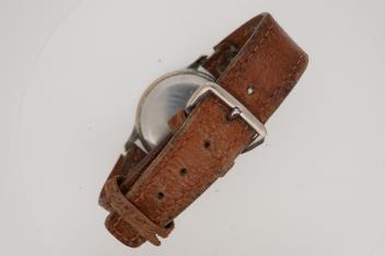 Perhaps some discolouration to the dial and numerals? Ni insignia on the winding crown. Numerous small nicks and brass metal showing around the back of the case to the underside of the rim, on both sides. Watch ticks when wound and the hands adjust. Strap quite worn.