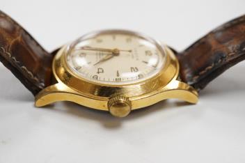 Lot 1930 , A gentleman's mid 20th century steel and gold plated Arden 'Super Automatic' wrist watch, with baton and Arabic numerals and seep seconds with red arrow pointer, case diameter 33mm, on an Omega brown leather strap.