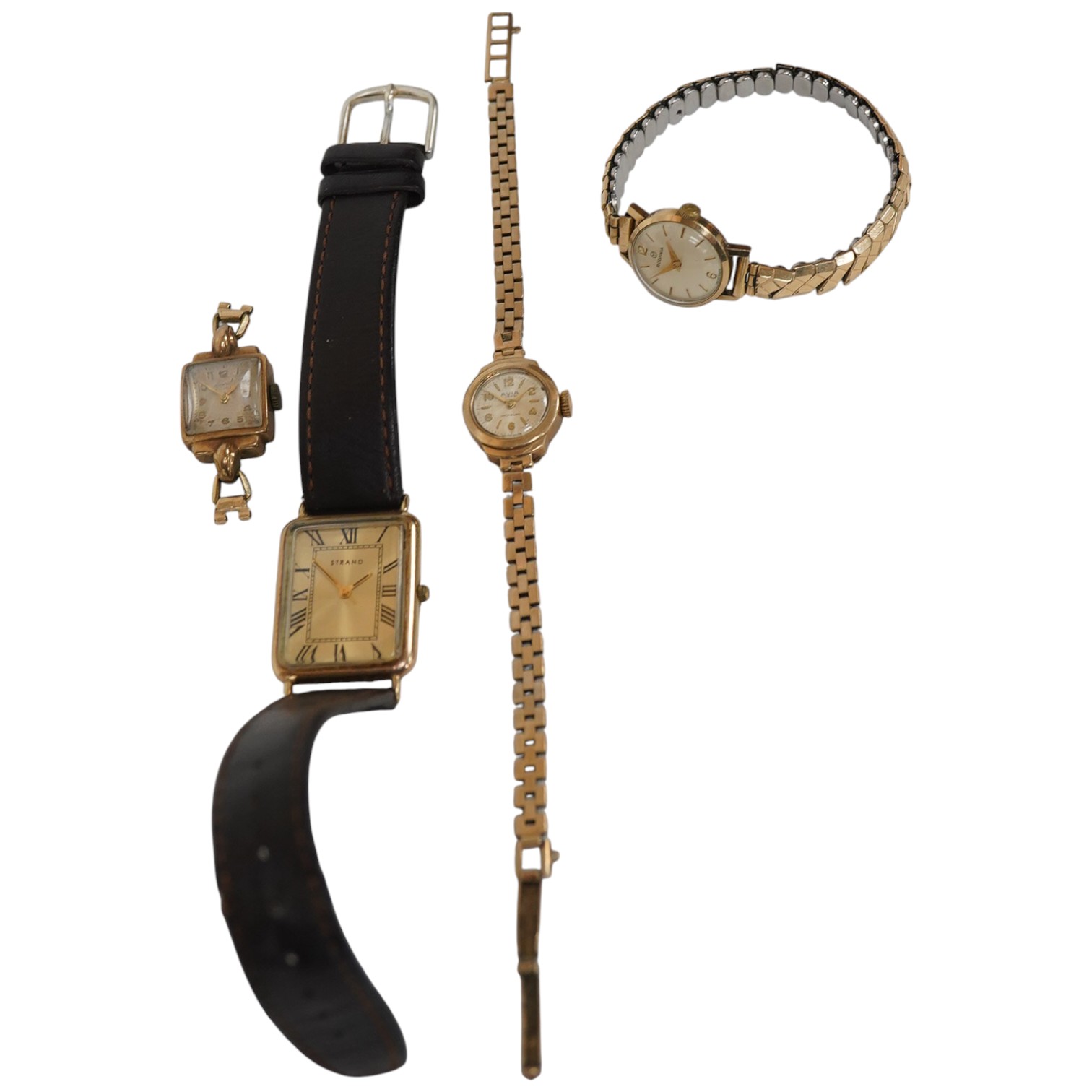 A gentleman's recent 9k Strand quartz dress wrist watch, with rectangular Roman dial, case diameter 24mm, on a leather strap, together with a lady's 1960's 9ct gold Avia manual wind wrist watch, on a 9ct gold bracelet, a lady's 9ct gold Accurist manual wind wrist watch(no strap) and a lady's 9ct gold Rodania manual wind wrist watch, on a flexible steel and gold plated strap.