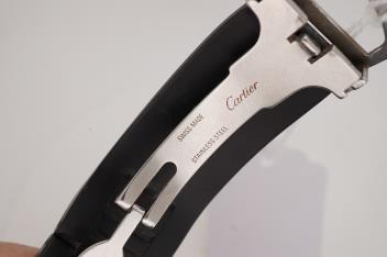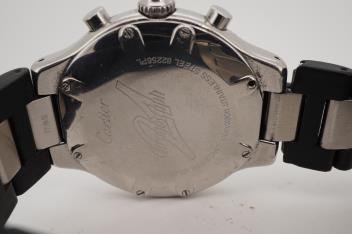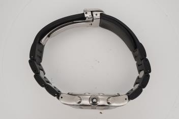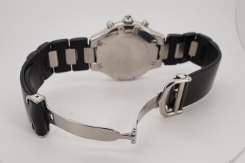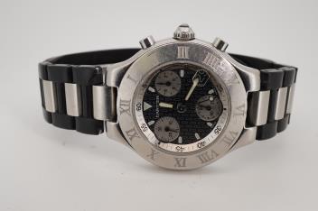Lot 110 , A gentleman's stainless steel Cartier 21 Chronoscaph wrist watch, the black face with three subsidiary dials, date aperture and baton numerals