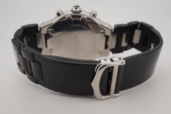 A gentleman's stainless steel Cartier 21 Chronoscaph wrist watch, the black face with three subsidiary dials, date aperture and baton numerals, with Roman chapter ring, case diameter 36mm, movement c.72, on a Cartier rubber strap with stainless steel deployment clasp, no box or papers.