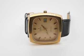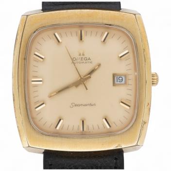 A gentleman's steel and gold plated Omega Seamaster automatic wrist watch, with baton numerals and date aperture, case diameter 38mm, on an associated leather strap, no box or papers.