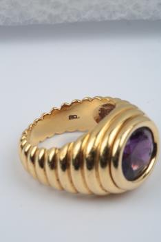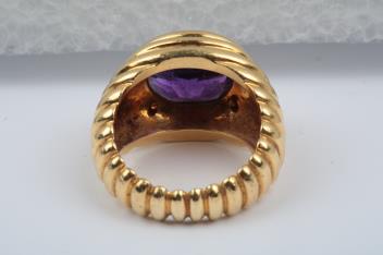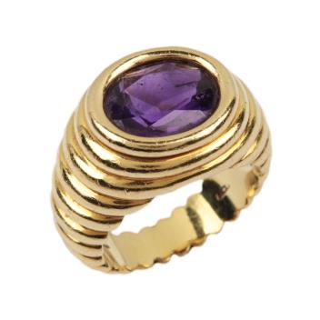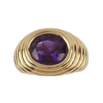 A gold and amethyst ring, circa 1997, collet-set with an oval amethyst in a stepped mount in 18ct gold, size J1/2, British hallmarks, sponsor's mark SMA, gross weight approximately 14 grams