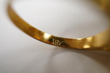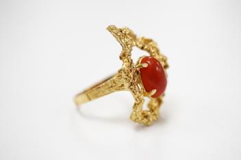 Lot 1918 , A gold and coral ring, 1970s, of textured design, set with a coral cabochon, mounted in gold, size N1/2, stamped 18K, gross weight approximately 7 grams