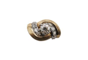 A gold and diamond cocktail ring, France, mid 20th century, claw-set with a circular-cut diamond weighing approximately 0.80 carats, to a sinuous mount of fluted design set with smaller circular-cut diamonds totalling approximately 0.50 carats, mounted in gold and platinum, size I1/2 (sizing beads), French assay marks for 18ct gold and platinum, partial French maker's marks, gross weight approximately 11 grams, case stamped Goldsmiths & Silversmiths Company