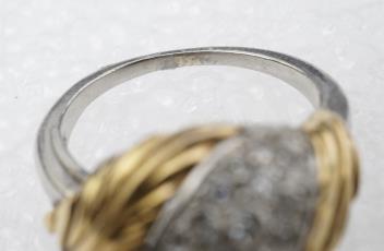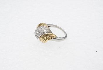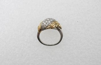 A gold and diamond dress ring, 1960s, of foliate design in bicoloured gold, centring on a section of pavé-set brilliant-cut diamonds totalling approximately 0.90 carats, size G