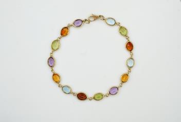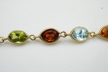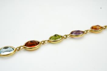 A gold and gem-set bracelet, composed of oval amethsyts, peridots, citrines and blue topazes, in gold spectacle settings, length 21cm, gross weight 9 grams