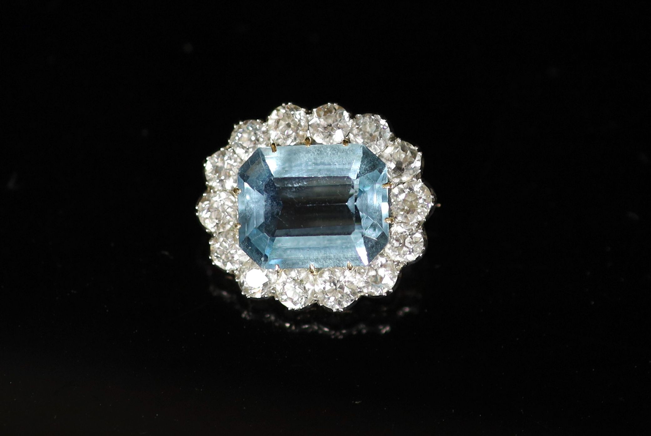 Lot 706 , A gold and silver, aquamarine and diamond set oval cluster brooch