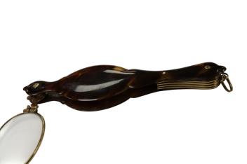 Lot 1938 , A gold and tortoiseshell lorgnette, early 20th century, the tortoiseshell handle enclosing a sprung lorgnette with 1.5x lenses, mounted in gold, stamped 9CT, length 12.2cm