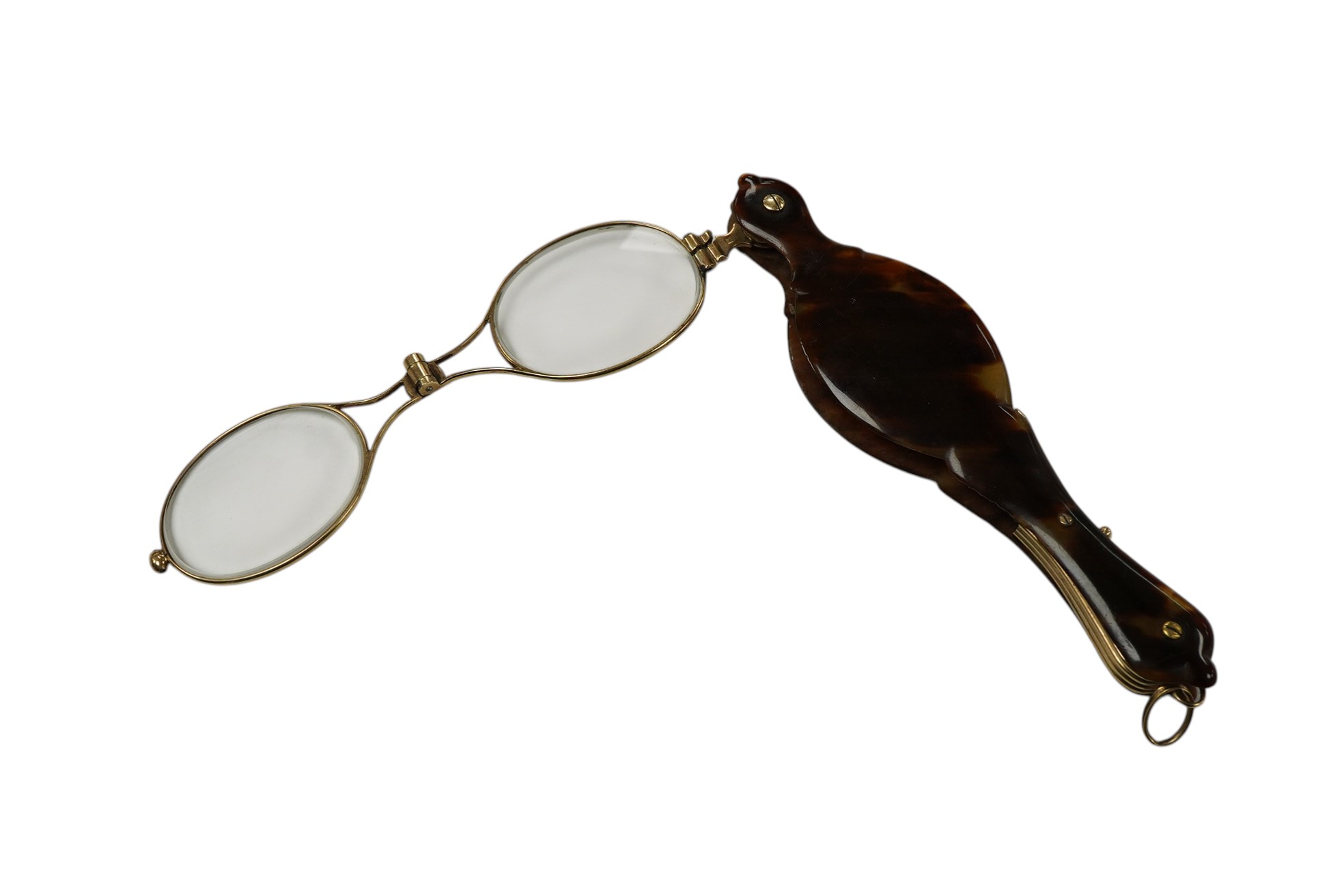 A gold and tortoiseshell lorgnette, early 20th century, the tortoiseshell handle enclosing a sprung lorgnette with 1.5x lenses, mounted in gold, stamped 9CT, length 12.2cm