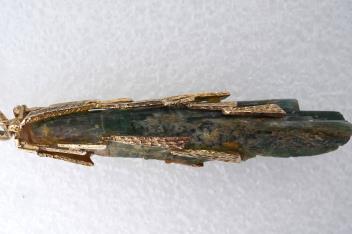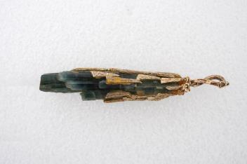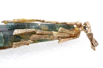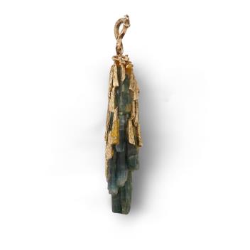 A gold and tourmaline crystal pendant, 1970s, the green tourmaline crystal held by a textured gold mount, length 10.2cm, gross weight approximately 35 grams, damaged