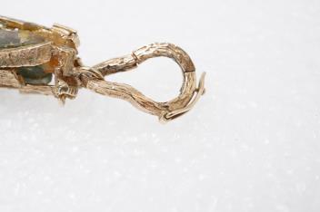 Significant damage - mount and crystal are broken and have been repaired with glue. Sensitive, specialist restoration required. Otherwise, nice quality and a striking design, crystal with typical surface features.