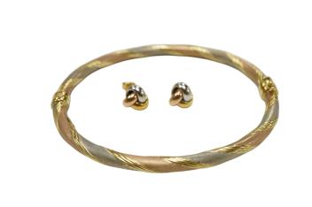 A gold bangle, of twisted design in tricoloured gold, inner circumference approximately 20cm, stamped 375, gross weight approximately 7 grams; together with a pair of stud earrings in tricoloured gold, gross weight approximately 0.8 grams, stamped 375