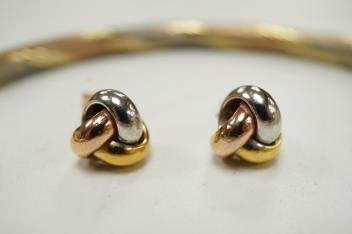 A gold bangle, of twisted design in tricoloured gold, inner circumference approximately 20cm, stamped 375, gross weight approximately 7 grams; together with a pair of stud earrings in tricoloured gold, gross weight appro