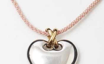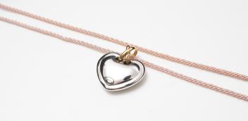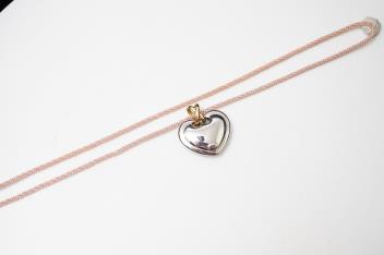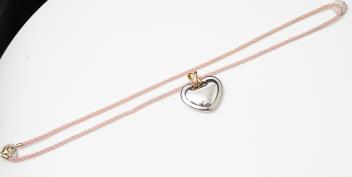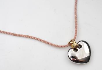 A gold pendant, designed as a heart in polished bicoloured gold, to a pink cord strap, pendant length 3cm, necklace length 48cm, pendant and clasp stamped 750, clasp with Italian maker's marks
