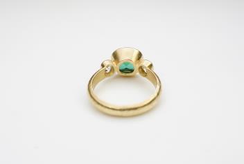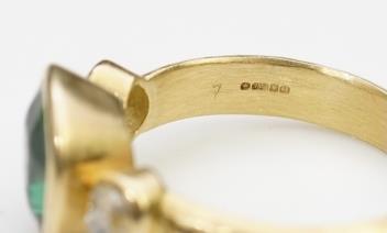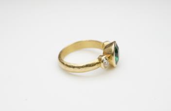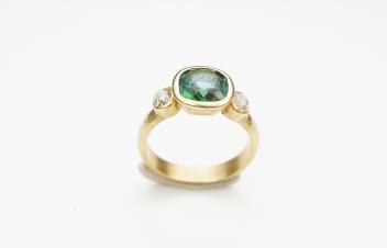 A green tourmaline and diamond ring, collet-set with a green tourmaline weighing approximately 1.50 carats, to shoulders collet-set with cushion-shaped diamonds totalling approximately 0.40 carats, mounted in 18ct gold with a planished finish, size M1/2, British hallmarks, gross weight approximately 6 grams