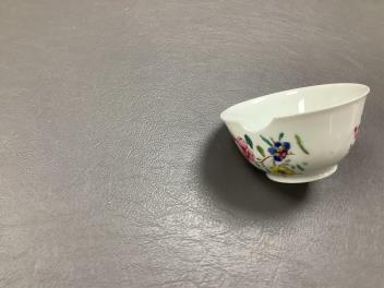 13/14cm saucers rims worn, two of these with small, shallow chips. One teabowl chipped. Three of these four 16/17cm plates with minor rim-chips. Larger plate good. ,