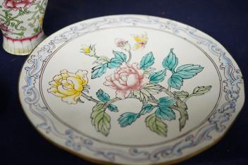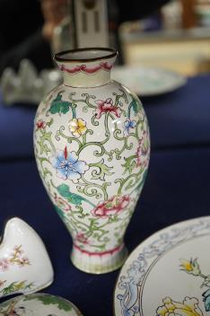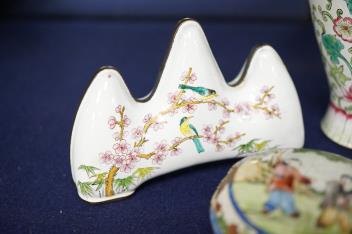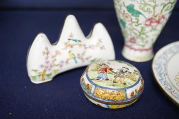 Lot 422 , A group of Chinese Canton enamel - an ovoid vase, a circular box and cover, a dish and a brush rest, vase 13cm