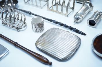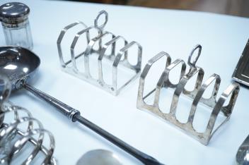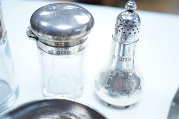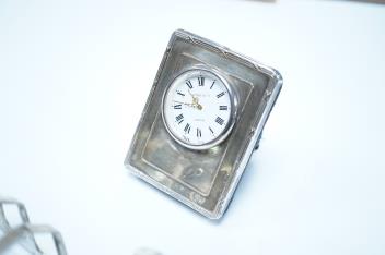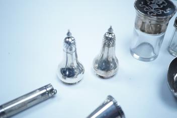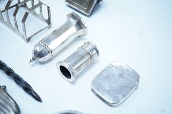 Lot 842 , A group of assorted silver, to include a pair of modern five bar toast racks, a George V card case, a sterling vesta case, four assorted condiments, two mounted toilet bottles, mounted timepiece, a modern wooden handled