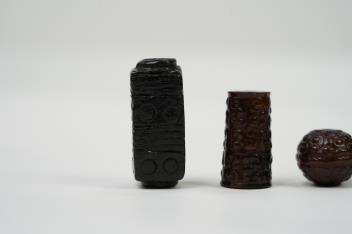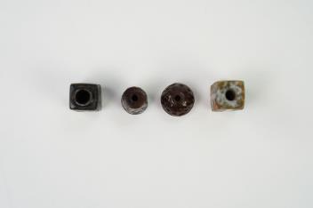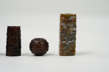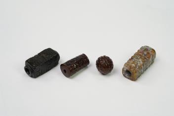 A group of four Chinese archaistic jade beads, two of cong form, in green brown and white metal jade and black jade, a cylinder carved in relief with rice grain design in brown jade and a similar globular bead, ranging from 1.8cm - 3.7cm (4)