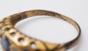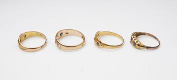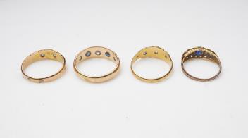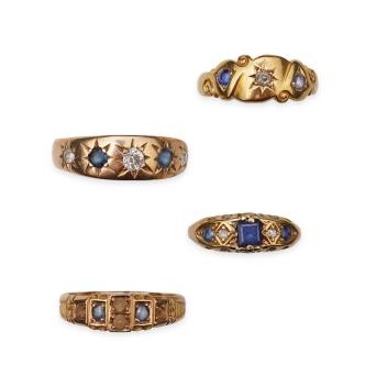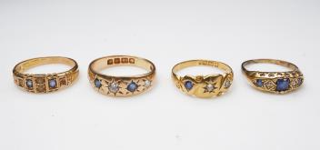 A group of four sapphire rings, late 19th/early 20th century, comprising: a ring set with three circular-cut diamonds totalling approximately 0.20 carats and two circular-cut sapphires in alternation, each within a star-shaped border, size O1/2; and a similar three-stone sapphire and diamond ring, the band of scrolled design, size N1/2, each with British hallmarks for 18ct gold, combined gross weight approximately 6.5 grams; a ring of stepped design, set with sapphires and seed pearls, mounted in 15ct gold, size N, British hallmarks, gross weight approximately 2.5 grams, seed pearls untested; and a ring set with a step-cut sapphire, to shoulders set with circular-cut sapphires and diamonds, mounted in gold, size K, partial British hallmark, gross weight approximately 1.5 grams