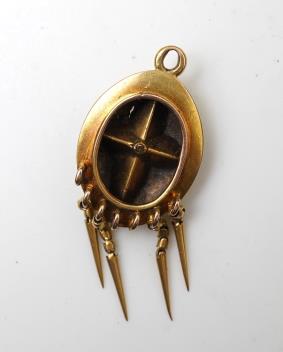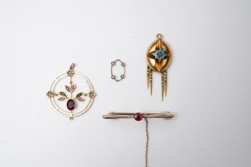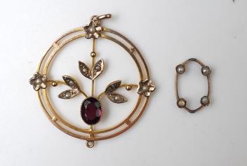 A group of jewels, 19th/early 20th century, comprising: a Victorian gold pendant centring on a star motif applied with light blue enamel, centring on a rose-cut diamond, suspending a fringe of small pendants en pampille, length 4cm; an Edwardian seed pearl and garnet pendant in gold, length 3.5cm, stamped 9CT; and a red paste bar brooch in gold, length 4.1cm, stamped 9ct, seed pearl border broken, total combined gross weight approximately 6.5 grams