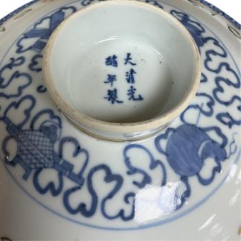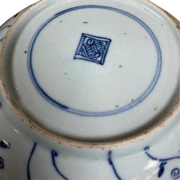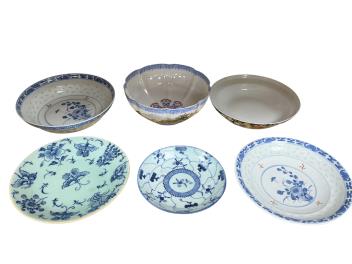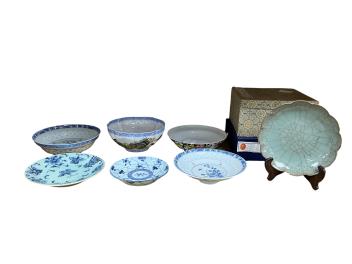 Lot 416 , A group of late 19th / 20th century Chinese porcelain - rice grain bowl and cover, two underglaze blue dishes, a thousand flower bowl- 19.5cm diameter, cased bowl and celadon dish