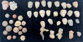 Lot 104 , A group of pre-Colombian terracotta heads, a partial figure and beads, Mexico